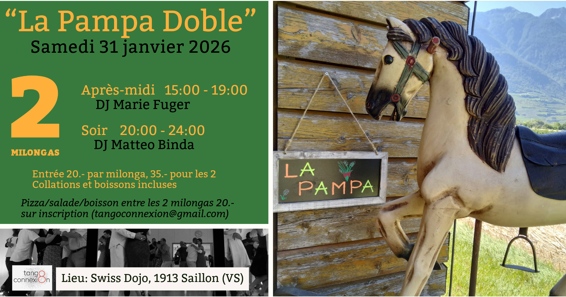 Entre les deux milongas, vous avez l’option de commander un repas pizza/salade/boissons pour 20.-