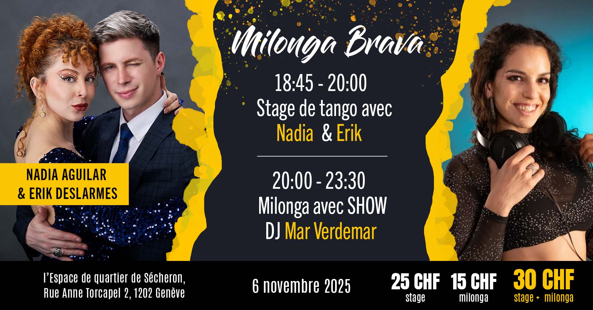 Comme toujours le jeudi, nous vous invitons à la Milonga Brava. Cette fois-ci, nous avons le grand plaisir d’accueillir le merveilleux couple de maestros : Nadia Aguilar & Erik Deslarmes !