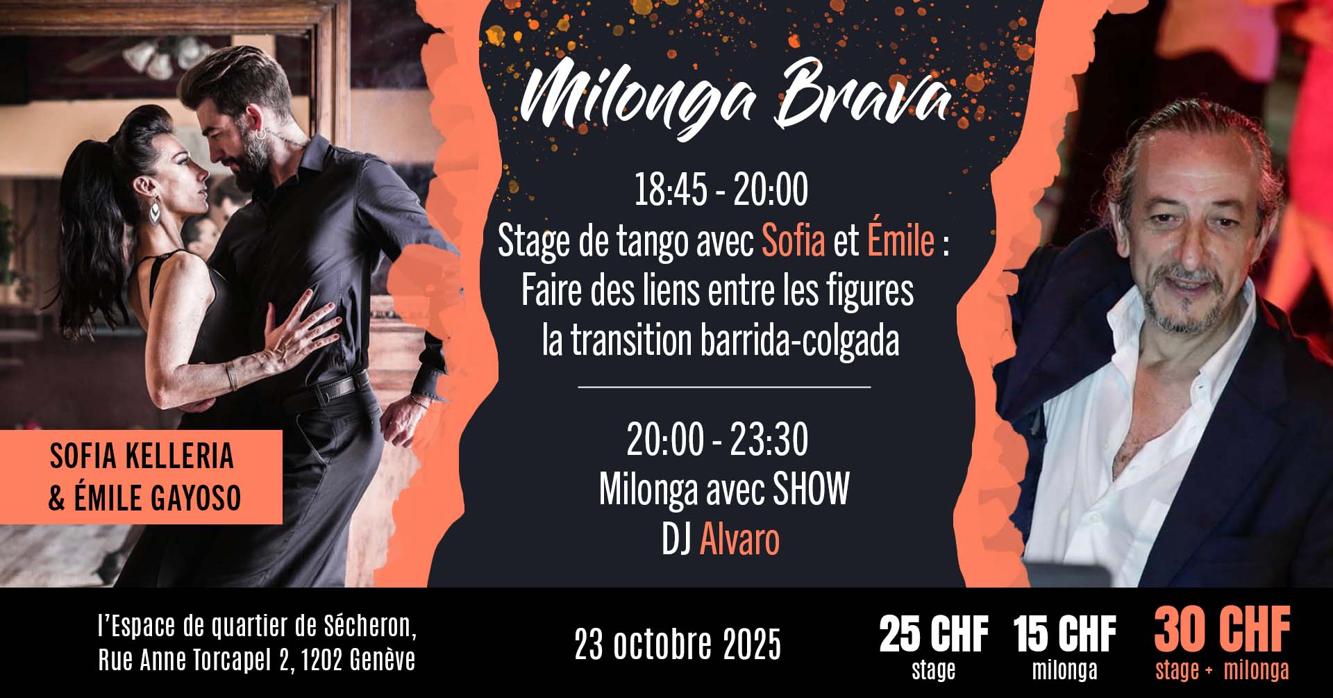 Comme toujours le jeudi, nous vous invitons à la Milonga Brava. Cette fois-ci, nous avons le grand plaisir d’accueillir le merveilleux couple de maestros : Sofia Kelleria & Émile Gayoso !