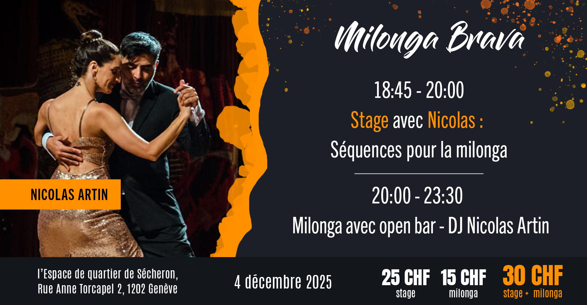 20:00 – 23:30 : Milonga Brava avec open bar – DJ Nicolas Artin