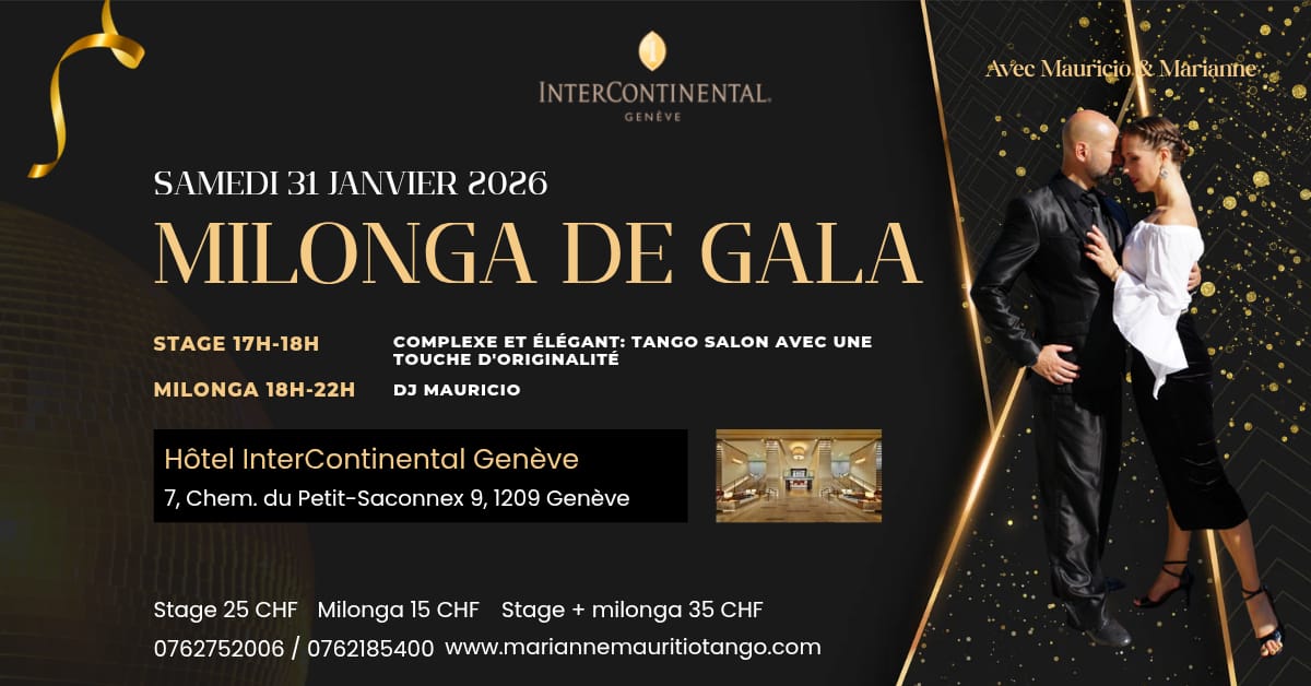 Organisation Mauricio & Marianne Téléphone +41 (0)76 275 20 06 Email marianne.kuusipalo@gmail.com Site Web www.mariannemauriciotango.com LieuHôtel Intercontinental, GenèveChemin du Petit-Saconnex 7/9, 1209 Genève, Switzerland Annoncer un stage spécial avant la milongaPrécédé d'un stage→ Choisissez votre DjTango Dj Dj Mauricio Borgarello Dj Mauricio Borgarello Date31 janvierExpiré! Heure 18:00 - 22:00 Tarif15.- Type d’événement01. Milonga ponctuelleMilonga de GalaMilonga De Gala dans le Hôtel Intercontinental.Stage 17h00-18h00Milonga 18h00-22h00 Partagez cet événement + Ajouter à mon Agenda Google+ Exporter vers iCal