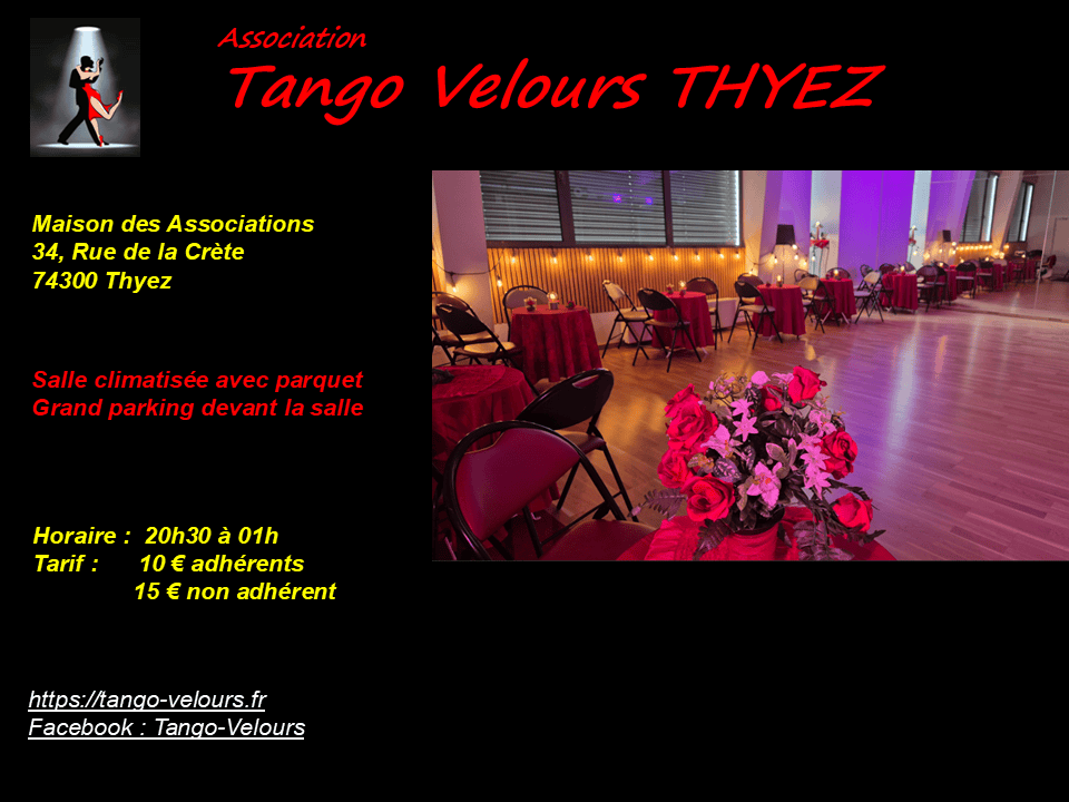 Organisation Association Tango-Velours Téléphone +33 7 82 12 29 39 Email info@tango-velours.fr Site Web www.tango-velours.fr LieuThyez, France34, Rue de la Crète, 74300 Thyez Date27 septembreExpiré! Heure 20:30 - 00:30 Tarif10.- Type d’événement02. Milonga régulièreMilonga Tango-VeloursMilonga à Thyez de l’association Tango-VeloursPartagez cet événement + Ajouter à mon Agenda Google+ Exporter vers iCal
