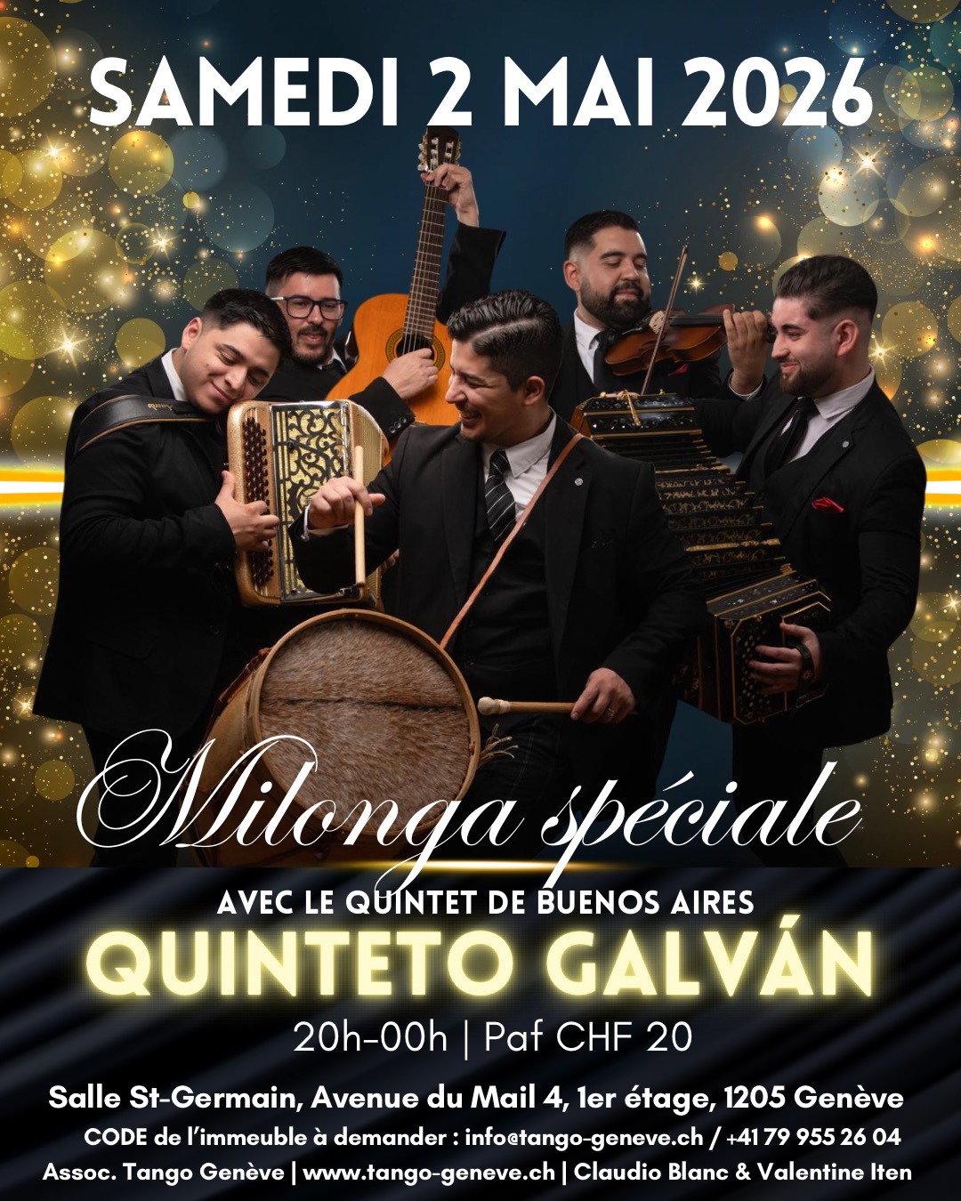 Organisation Tango Genève Téléphone +41 79 955 26 04 (Claudio & Valentine) Email claudio.blanc@tango-geneve.ch Site Web www.tango-geneve.ch LieuSalle Saint-Germain (digicode), GenèveAvenue du Mail 4, GenèveÉvénement spécial El Quinteto Galván → Choisissez votre DjTango Dj Dj invité Dj invité Date2 mai Heure 20:00 - 00:00 Tarif20.- Type d’événement01. Milonga ponctuelleMilonga Tango GenèvePartagez cet événement + Ajouter à mon Agenda Google+ Exporter vers iCal