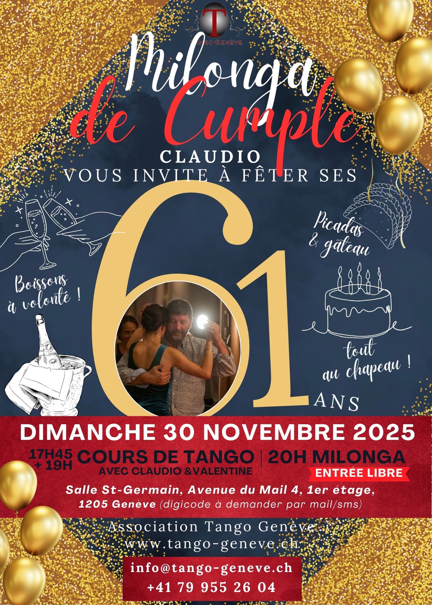 La soirée est précédée des deux cours collectifs de Tango (selon les horaires habituels) donnés par Claudio Blanc et Valentine Iten. Sur inscription (de préférence avec partenaire).